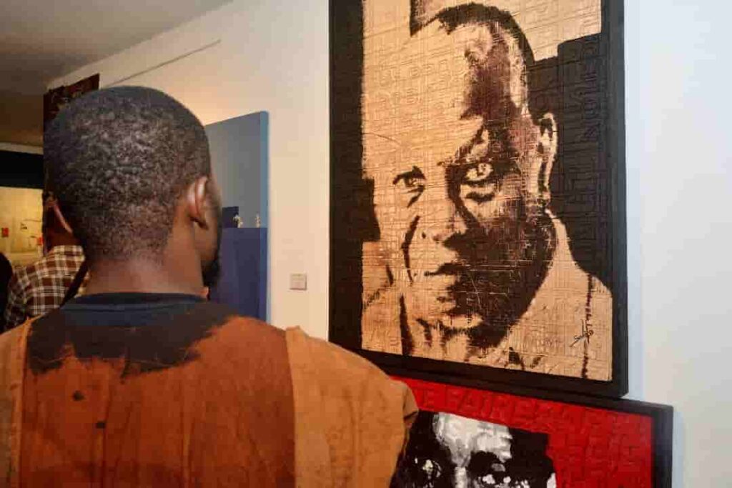 Cecko Nihckasson Diabaté, plasticien et neveu de l’écrivain par sa grand-mère Matogoma Makanaté Kourouma, a conçu une œuvre picturale singulière inspirée des pages 98 et 99 du roman ‘’Allah n’est pas obligé’’.
