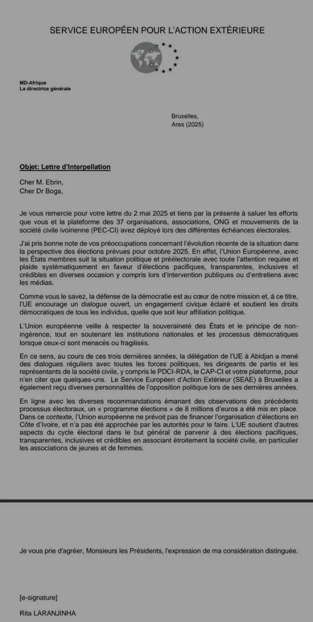 Je vous remercie pour votre lettre du 2 mai 2025 et tiens par la présente à saluer les efforts que vous et la plateforme ces 37 organisations, associations, ONG et mouvements de la société civile ivoirienne (PEC-CI) avez déployé lors des différentes échéances électorales.