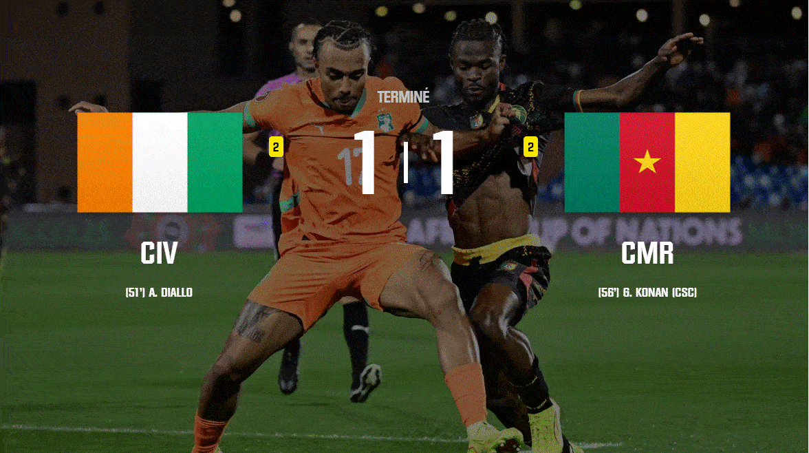 Après une première période équilibrée, les champions d’Afrique ivoiriens ont pris l’avantage au retour des vestiaires grâce à Amad Diallo, auteur de l’ouverture du score à la 51e minute. La réaction camerounaise ne s’est pas fait attendre : cinq minutes plus tard, une malheureuse déviation de Ghislain Konan contre son camp permettait aux Lions Indomptables de recoller au score.
