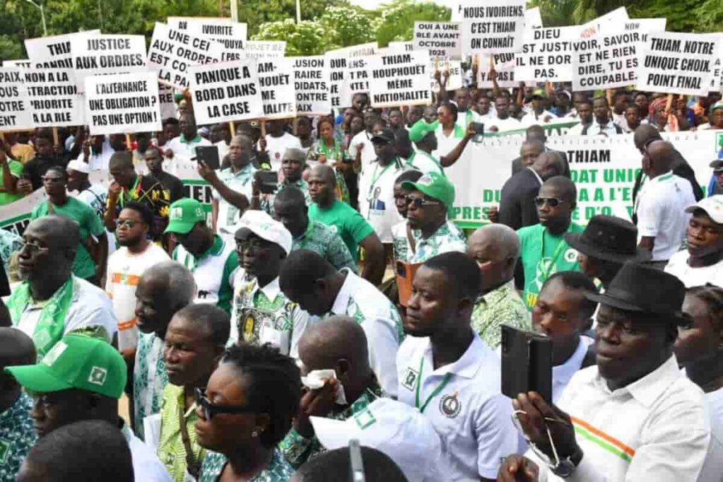 Le samedi 7 juin 2025, le soleil est au zénith sur Daoukro, fief historique du Parti démocratique de Côte d’Ivoire (PDCI-RDA). Sur la place Henri Konan Bédié, les drapeaux vert et blanc flottent haut. Une foule compacte s’y rassemble. L’ambiance est à la fois déterminée et grave : militants, cadres, élus locaux, tous sont venus dire non à la radiation de leur leader, Tidjane Thiam, de la liste électorale définitive.