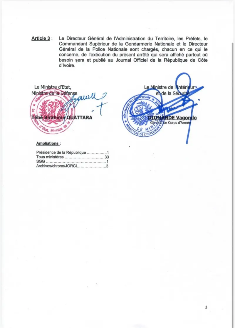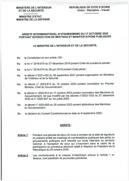 À seulement huit jours de l’élection présidentielle, un arrêté interministériel signé le 17 octobre 2025 vient bouleverser la vie politique ivoirienne. Le texte interdit pour deux mois les meetings et manifestations publiques sur tout le territoire national, suspendant ainsi une partie de l’activité des partis et groupements politiques. Signé par le ministre de l’Intérieur et de la Sécurité, Vagondo Diomandé, et le ministre d’État, ministre de la Défense, Téné Birahima Ouattara, l’arrêté prend effet immédiatement et restera en vigueur jusqu’au 17 décembre 2025.