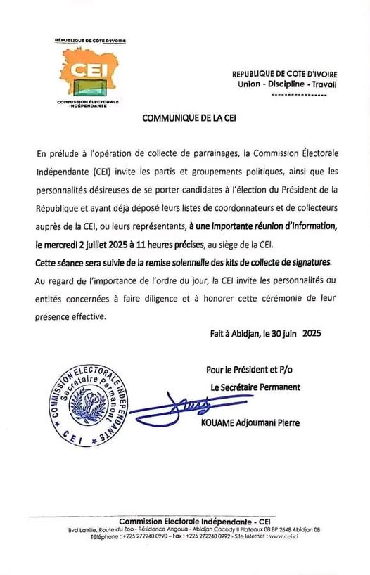 Dans le cadre des préparatifs pour l’élection présidentielle d’octobre 2025, la Commission Électorale Indépendante (CEI) annonce la tenue imminente d’une importante réunion d’information. Cette rencontre est destinée aux partis politiques, groupements et personnalités ayant déjà transmis leur liste de coordonnateurs dans la perspective du scrutin.