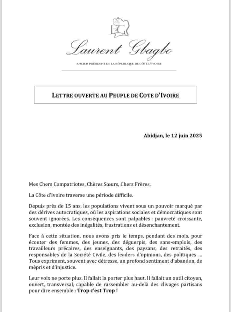 Écarté de la course à la présidence, mais pas du débat public, Laurent Gbagbo revient sur le devant de la scène politique ivoirienne avec un nouvel appel vibrant. Dans une lettre ouverte au peuple, publiée le jeudi 12 juin 2025 Abidjan, l’ancien chef d’État appelle ses compatriotes à se mobiliser autour d’un nouveau mouvement citoyen baptisé « Trop, c’est trop ! ».
