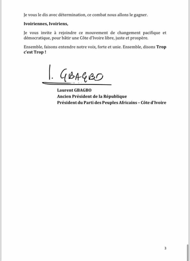 « C’est une invitation à la résistance pacifique. Pour une Côte d’Ivoire qui respire, qui écoute, qui respecte ses propres lois », conclut-il.