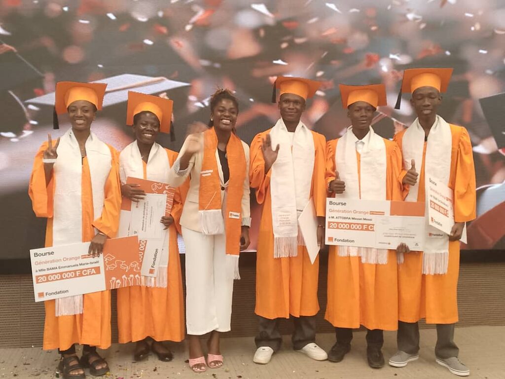 Le programme « Génération Orange », piloté par la Fondation Orange Côte d’Ivoire, accompagne chaque année une quarantaine de lycéens sur trois ans, de la seconde à la terminale, en leur fournissant bourses, kits scolaires et appui pédagogique.