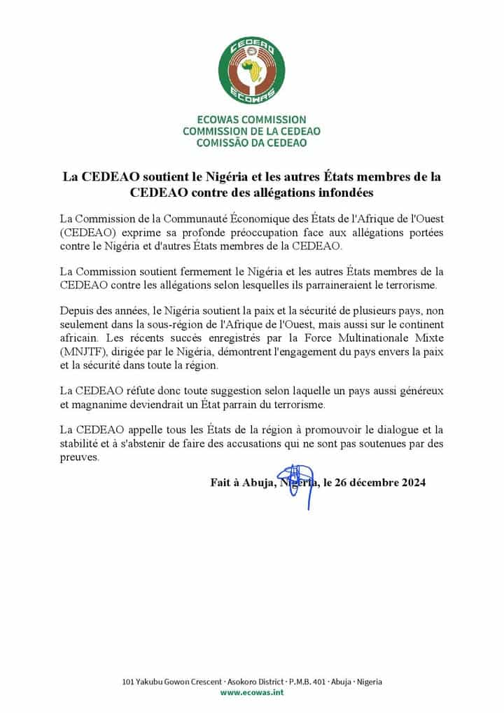 La Commission de la Communauté Économique des États de l’Afrique de l’Ouest (CEDEAO) a rejeté les allégations portées contre le Nigéria et d’autres États membres, les accusant de parrainer le terrorisme. Ce, dans un communiqué publié le 26 décembre 2024 à Abuja.