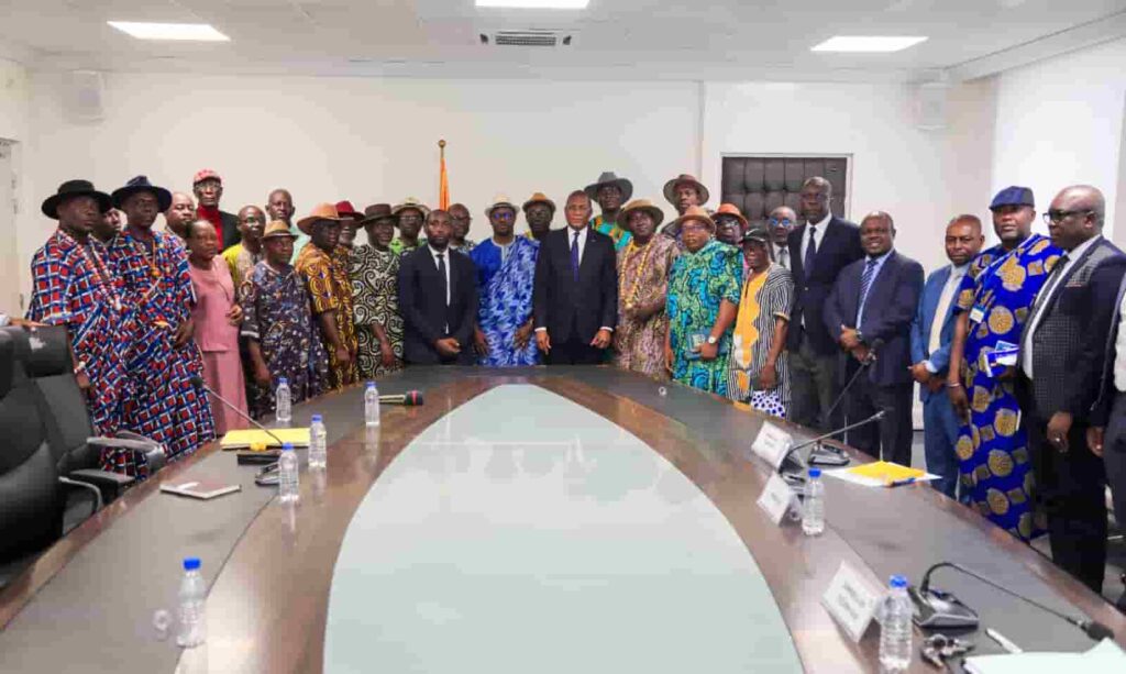 Les Chefs Atchan, Alladjan, Kroumen et Akye du District Autonome d’Abidjan, ont donné leur feu vert pour la mise en œuvre du projet d’Assainissement et de sécurisation du Domaine Urbain (ADU). Ces auxiliaires de l’administration ont exprimé leur soutien à la mise en œuvre de ladite réforme le mercredi 28 mai 2025. Notamment lors d’une rencontre qu’ils ont eue avec le Ministre de la construction du Logement et de l’urbanisme, Bruno Nabagné Koné à son Cabinet. Laquelle rencontre a été marquée par la signature symbolique de la première ADU relative au lotissement dénommé Adiapoto Beikeito, après plusieurs mois d’échanges avec le gouvernement.