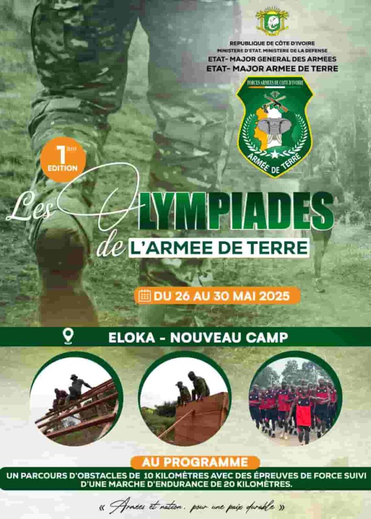 Du 26 au 30 mai 2025, le nouveau Camp d’Eloka sera le théâtre d’un événement inédit dans le calendrier militaire ivoirien : les toutes premières Olympiades de l’Armée de Terre. Placée sous l’autorité de l’État-major de l’Armée de Terre et organisée sous l’égide du Ministère d’État, Ministère de la Défense, cette compétition rassemblera des soldats issus de diverses unités pour cinq jours de défis physiques intenses et de fraternité militaire.