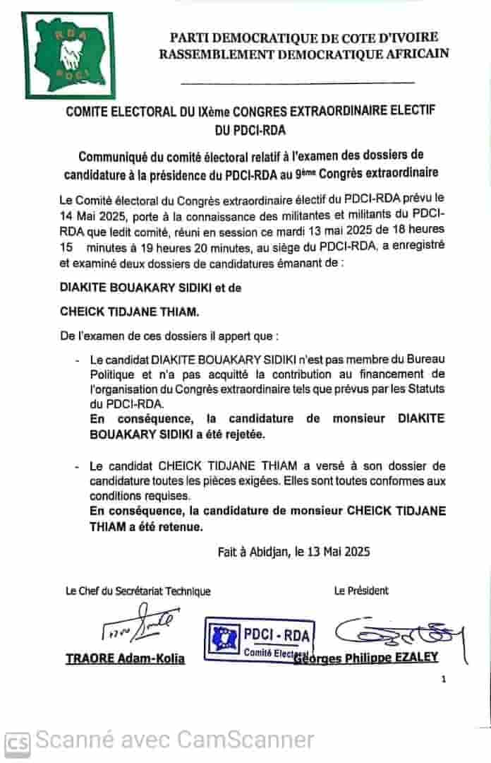 La candidature de Diakité Bouakary Sidiki, en vue de la présidence du Parti démocratique de Côte d’Ivoire (PDCI), a été rejettéé. Au regard des statuts, le parti estime qu’il est un militant qui « n’est pas membre du Bureau politique. Aussi, qui n’a pas acquitté la contribution (de 30 millions Fcfa) au financement de l’organisation du congrès extraordinaire ».